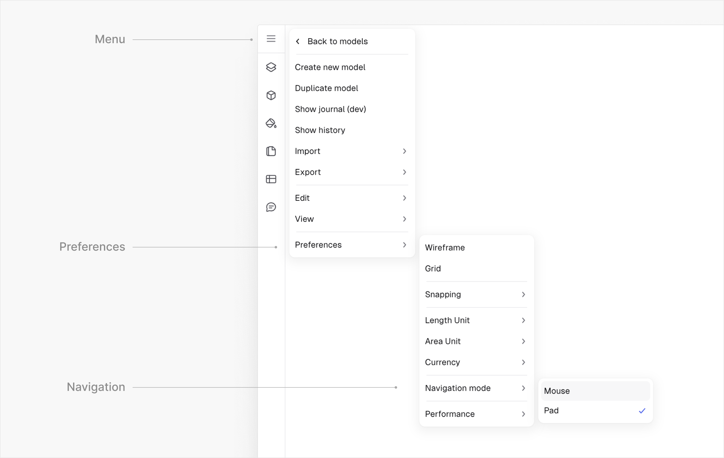 La navigation dans Rayon est simple. Tout ce que vous avez à faire est de choisir un **mode de navigation**, en utilisant la **Souris** ou le **Trackpad** selon votre préférence.