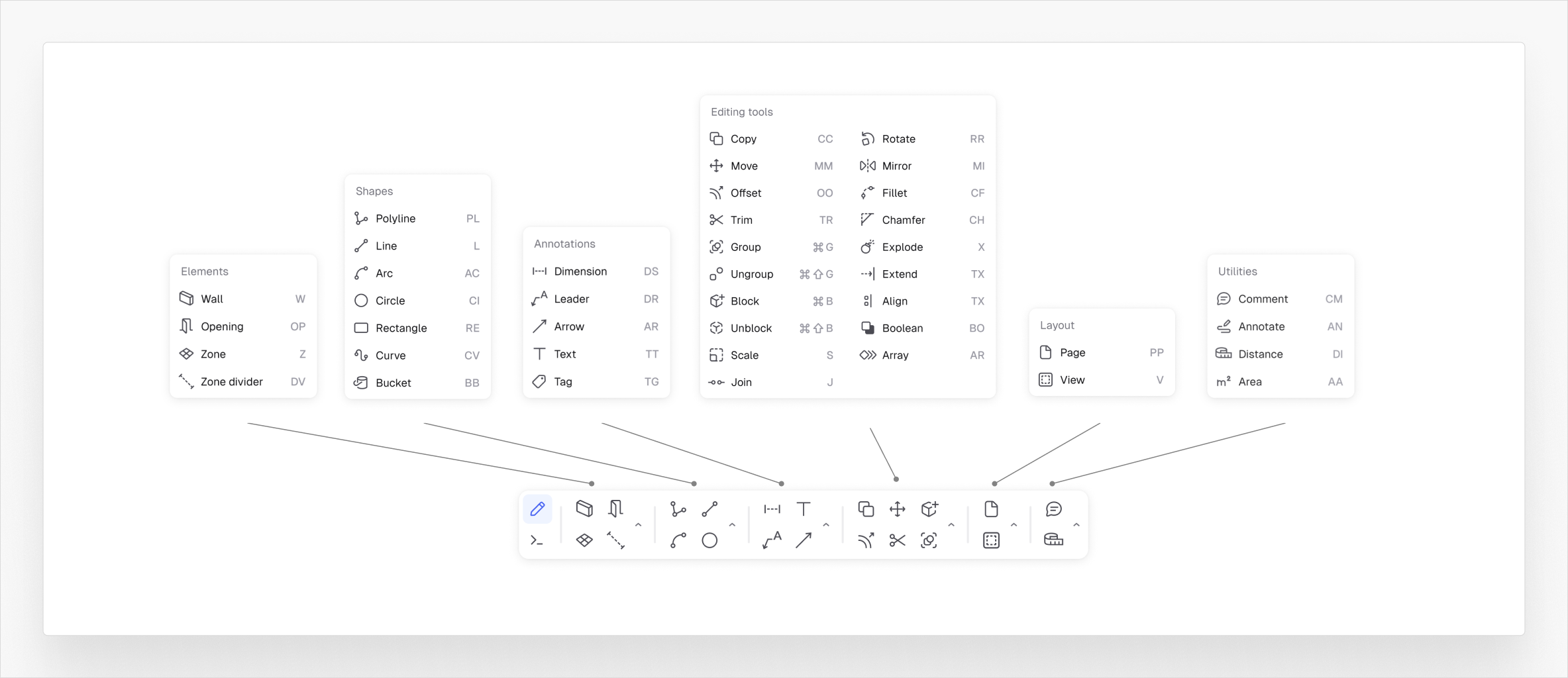 <table data-full-width="false"><thead><tr><th width="168">Raccourci</th><th width="201">Commandement</th><th>Mode (bascule)</th><th data-hidden>a</th></tr></thead><tbody><tr><td><strong><code>ESPACE</code></strong> ou <code>↵</code></td><td>Déclencher la dernière commande</td><td></td><td></td></tr><tr><td><strong><code>CTRL</code></strong> + <strong><code>K</code></strong></td><td>Ligne de commande</td><td></td><td></td></tr><tr><td><strong><code>W</code></strong></td><td>Mur</td><td><strong><code>A</code></strong> : ligne/arc<br><strong><code>S</code></strong> : alignement gauche/centre/droite<br><strong><code>L</code></strong> : une fois/boucle</td><td></td></tr><tr><td><strong><code>OP</code></strong></td><td>Ouverture</td><td><strong><code>L</code></strong> : une fois/boucle</td><td></td></tr><tr><td><strong><code>Z</code></strong></td><td>Zone</td><td><strong><code>L</code></strong> : une fois/boucle</td><td></td></tr><tr><td><strong><code>DV</code></strong></td><td>Séparateur de zone</td><td><strong><code>A</code></strong> : ligne/arc<br><strong><code>L</code></strong> : une fois/boucle</td><td></td></tr><tr><td><strong><code>PL</code></strong></td><td>Polyligne</td><td><strong><code>A</code></strong> : ligne/arc<br><strong><code>L</code></strong> : une fois/boucle</td><td></td></tr><tr><td><strong><code>L</code></strong></td><td>Ligne</td><td><strong><code>L</code></strong> : une fois/boucle</td><td></td></tr><tr><td><strong><code>AC</code></strong></td><td>Arc</td><td><strong><code>A</code></strong>: rayon/angle<br><strong><code>L</code></strong> : une fois/boucle</td><td></td></tr><tr><td><strong><code>CV</code></strong></td><td>Courbe</td><td><strong><code>L</code></strong> : une fois/boucle</td><td></td></tr><tr><td><strong><code>CI</code></strong></td><td>Cercle</td><td><strong><code>L</code></strong> : une fois/boucle</td><td></td></tr><tr><td><strong><code>RE</code></strong></td><td>Rectangle</td><td><strong><code>L</code></strong> : une fois/boucle</td><td></td></tr><tr><td><strong><code>G</code></strong></td><td>Lignes directrices</td><td><strong><code>O</code></strong> : horizontal/vertical/libre<br><strong><code>L</code></strong> : une fois/boucle</td><td></td></tr><tr><td><strong><code>BB</code></strong></td><td>Seau</td><td></td><td></td></tr><tr><td><strong><code>DI</code></strong></td><td>Dimensions</td><td><strong><code>O</code></strong> : aligné/horizontal/vertical/rotation<br><strong><code>C</code></strong> : simple/enchaîné<br><strong><code>L</code></strong> : une fois/boucle</td><td></td></tr><tr><td><strong><code>DR</code></strong></td><td>Chef de file</td><td></td><td></td></tr><tr><td><strong><code>AW</code></strong></td><td>Flèche</td><td><strong><code>A</code></strong> : ligne/arc</td><td></td></tr><tr><td><strong><code>TT</code></strong></td><td>Texte</td><td></td><td></td></tr><tr><td><strong><code>TG</code></strong></td><td>Étiquette</td><td></td><td></td></tr><tr><td><strong><code>CC</code></strong></td><td>Copie</td><td></td><td></td></tr><tr><td><strong><code>MM</code></strong></td><td>Déplacer</td><td></td><td></td></tr><tr><td><strong><code>OO</code></strong></td><td>Décalage</td><td></td><td></td></tr><tr><td><strong><code>TR</code></strong></td><td>Rogner</td><td></td><td></td></tr><tr><td><strong><code>S</code></strong></td><td>Échelle</td><td><strong><code>S</code></strong> : sélection/dessin</td><td></td></tr><tr><td><strong><code>J</code></strong></td><td>Rejoindre</td><td></td><td></td></tr><tr><td><strong><code>RR</code></strong></td><td>Rotation</td><td></td><td></td></tr><tr><td><strong><code>MI</code></strong></td><td>Miroir</td><td><strong><code>C</code></strong> : déplacer/copier</td><td></td></tr><tr><td><strong><code>BR</code></strong></td><td>Couper</td><td><strong><code>B</code></strong> : point / éléments</td><td></td></tr><tr><td><strong><code>DD</code></strong></td><td>Diviser</td><td><strong><code>M</code></strong> : nombre / distance</td><td></td></tr><tr><td><strong><code>CF</code></strong></td><td>Raccord</td><td><strong><code>S</code></strong> : unique/toutes</td><td></td></tr><tr><td><strong><code>CH</code></strong></td><td>Chanfrein</td><td><strong><code>R</code></strong> : régulier/irrégulier</td><td></td></tr><tr><td><strong><code>X</code></strong></td><td>Exploser</td><td></td><td></td></tr><tr><td><strong><code>TX</code></strong></td><td>Étendre</td><td></td><td></td></tr><tr><td><strong><code>AR</code></strong></td><td>Réseau</td><td></td><td></td></tr><tr><td><strong><code>AL</code></strong></td><td>Aligner</td><td><strong><code>S</code></strong> : non mis à l'échelle/mis à l'échelle</td><td></td></tr><tr><td><strong><code>B</code></strong></td><td>Booléen</td><td><strong><code>B</code></strong> : union/intersection/exclusion/soustraction</td><td></td></tr><tr><td><strong><code>CTRL</code></strong> + <strong><code>B</code></strong></td><td>Bloc</td><td></td><td></td></tr><tr><td><strong><code>CTRL</code></strong> + <strong>⇧</strong> + <strong><code>B</code></strong></td><td>Détacher Bloc</td><td></td><td></td></tr><tr><td><strong><code>CTRL</code></strong> + <strong><code>G</code></strong></td><td>Groupe</td><td></td><td></td></tr><tr><td><strong><code>CTRL</code></strong> + <strong>⇧</strong> + <strong><code>G</code></strong></td><td>Exploser Groupe</td><td></td><td></td></tr><tr><td><strong><code>PP</code></strong></td><td>Page</td><td><strong><code>A</code></strong> Mode de dessin/insertion : mode de dessin/insertion</td><td></td></tr><tr><td><strong><code>V</code></strong></td><td>Vue</td><td></td><td></td></tr><tr><td><strong><code>CM</code></strong></td><td>Commentaire</td><td></td><td></td></tr><tr><td><strong><code>AN</code></strong></td><td>Annoter</td><td></td><td></td></tr><tr><td><strong><code>DS</code></strong></td><td>Distance</td><td><strong><code>P</code></strong> mode ligne/polyligne<br><strong><code>L</code></strong> : une fois/boucle</td><td></td></tr><tr><td><stro
