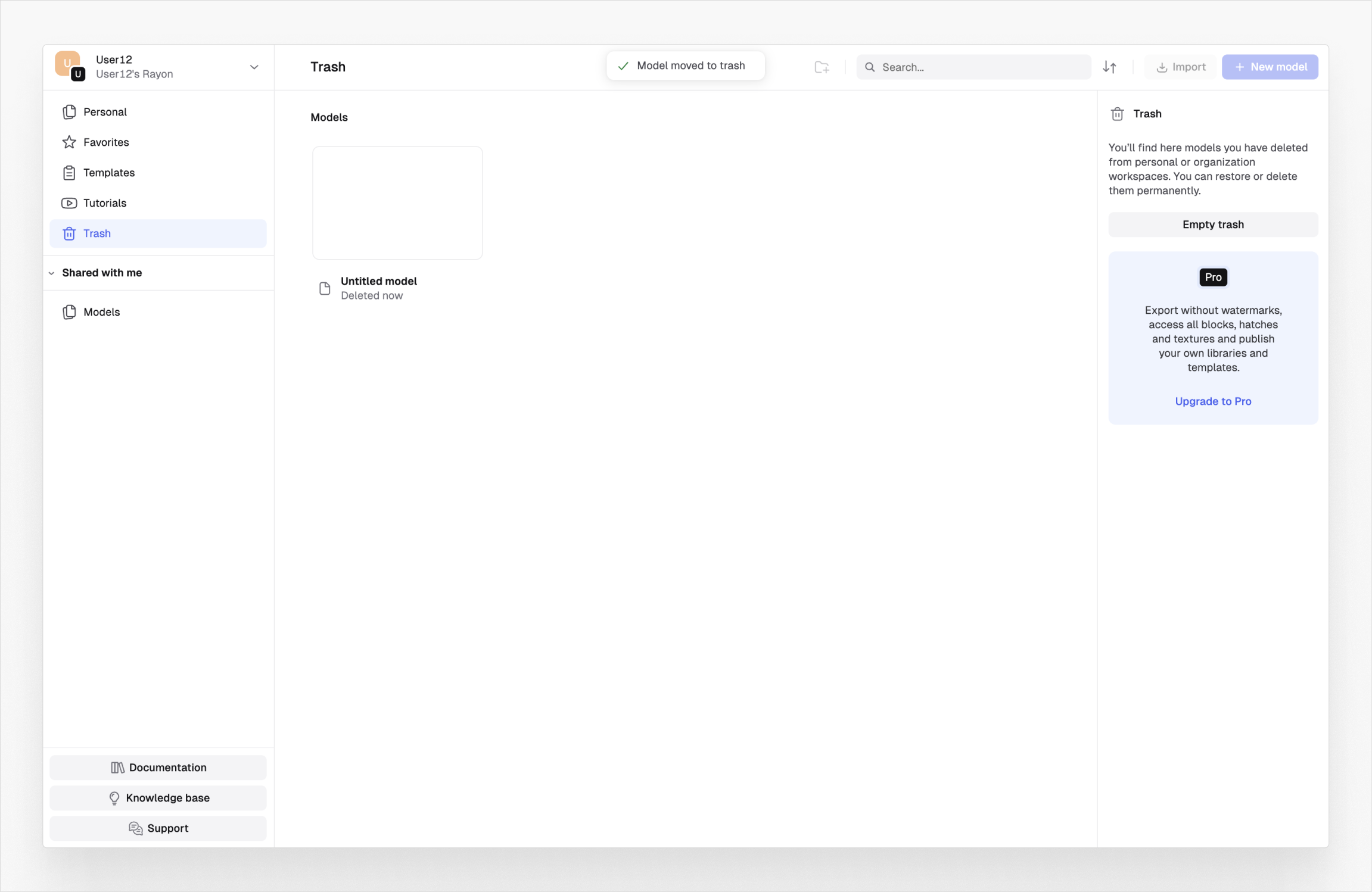 * Vous pouvez toujours **`Restaurer`** vos dessins dans votre espace de travail à partir de la poubelle.