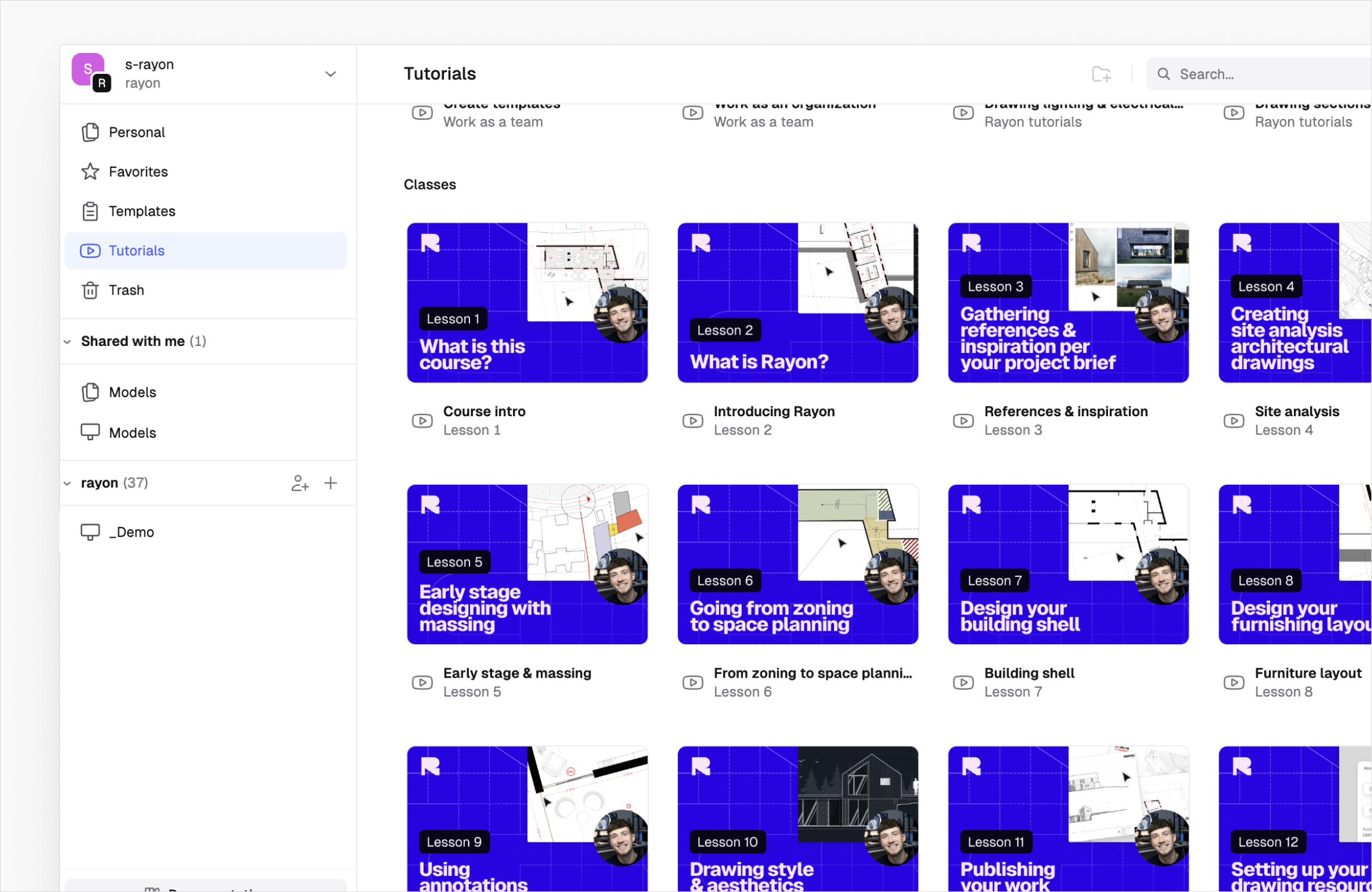 We worked this month with Thomas Rowntree, architect and educator, to build **a 12 lesson lecture series**, teaching how to go from 0 to 1 for any typical architectural project. The class can be found in the [Tutorial section](https://www.rayon.design/app/files/tutorials) of the app.