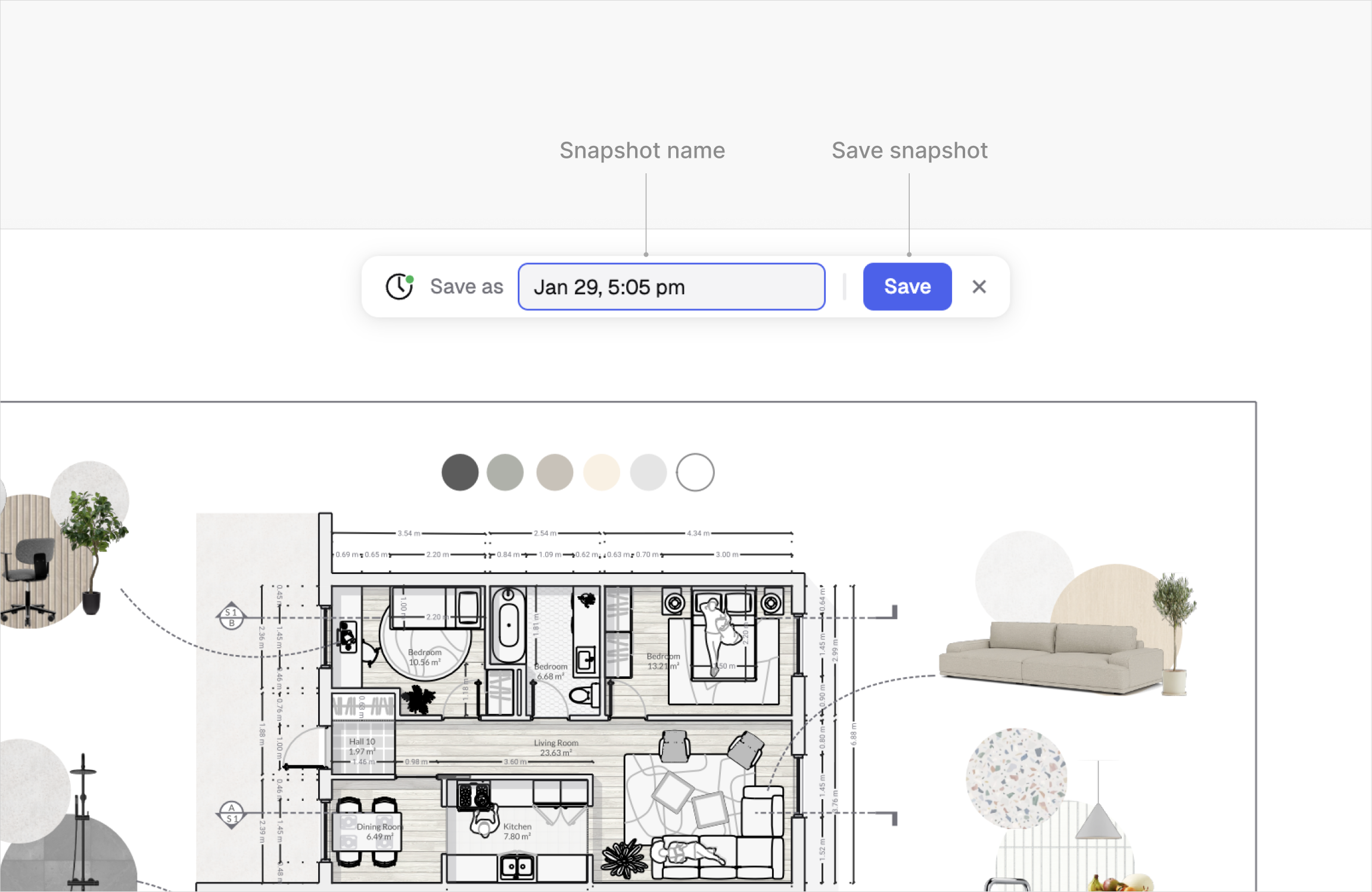 We added this month a new **save option**, allowing users to capture a model snapshot, give it a name and save it to their model history. This feature can be found by clicking on **`+`** in the history panel, or by hitting **`CMD`** + **`S`**