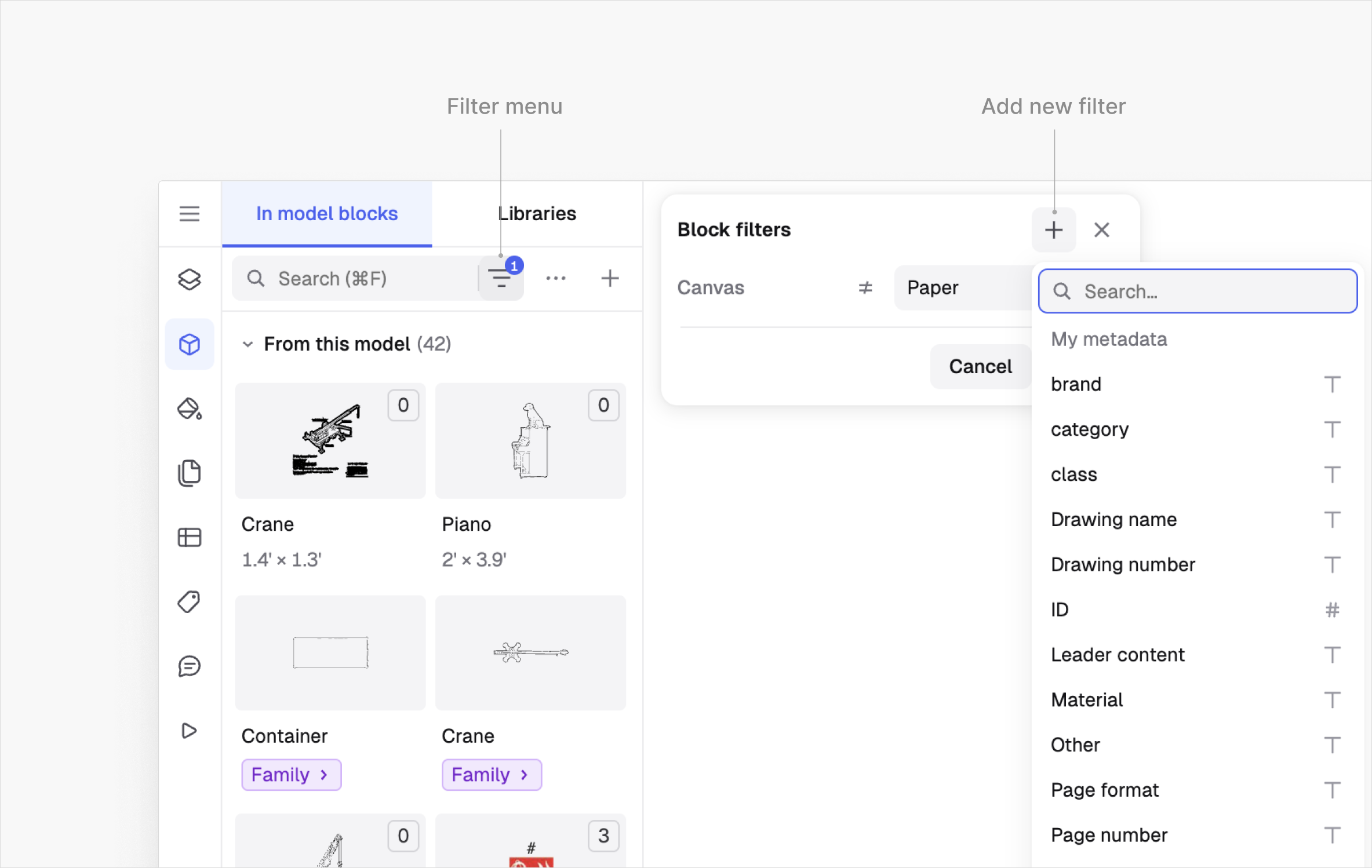One key addition of this month is the **ability for users to filter the content of block libraries**. A new filter option allows using blocks properties to display assets based on their size, name, price, standard, etc. At the same, a block/library toggle was introduced, to offer a simpler way to decide whether to search blocks or libraries.